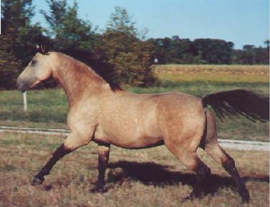 The late PKR PRIMAVERA BRIO (Primavera Valdez X Rose Hill LaPapillion), 1994 buckskin stallion owned by John Hutcheson,