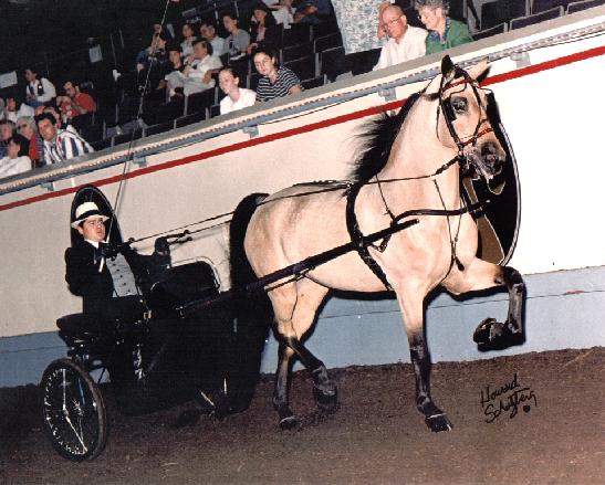 PRAIRIE RUN LIZ-T (PRM Thunderbird X Prairie Run Fantisy), 1993 buckskin mare owned by Patty Clark, Promised Land Farm. She is shown here in a pleasure driving class with Patty's son Andres Guardiola.