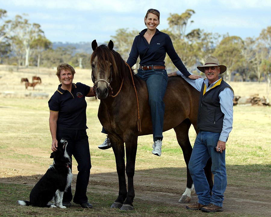 RANCHBOSS CORTEZ (Primavera Valdez x Telura's Black Gold), 1999 buckskin stallion owned by Wilga Park Morgans, Queensland, Australia. Shown with Cortez are (L-R) Kathy Lyons, Christine Maroni (on Cortez), and Greg Lyons.