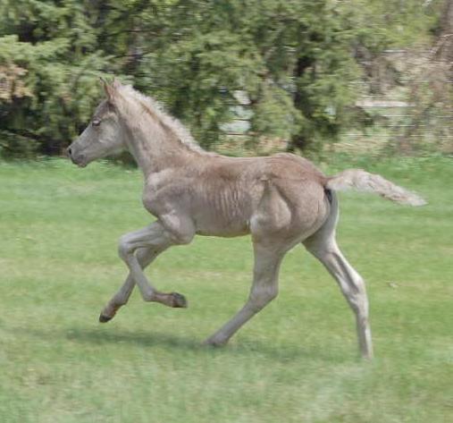 WHITING'S FANCY STAR (Foxton Debonair X Foxton Fawn), 1999 silver dapple mare, pictured here as a (sun-faded) yearling. Fancy Star is one of several classic silver dapple offspring of Foxton Fawn. She is owned by