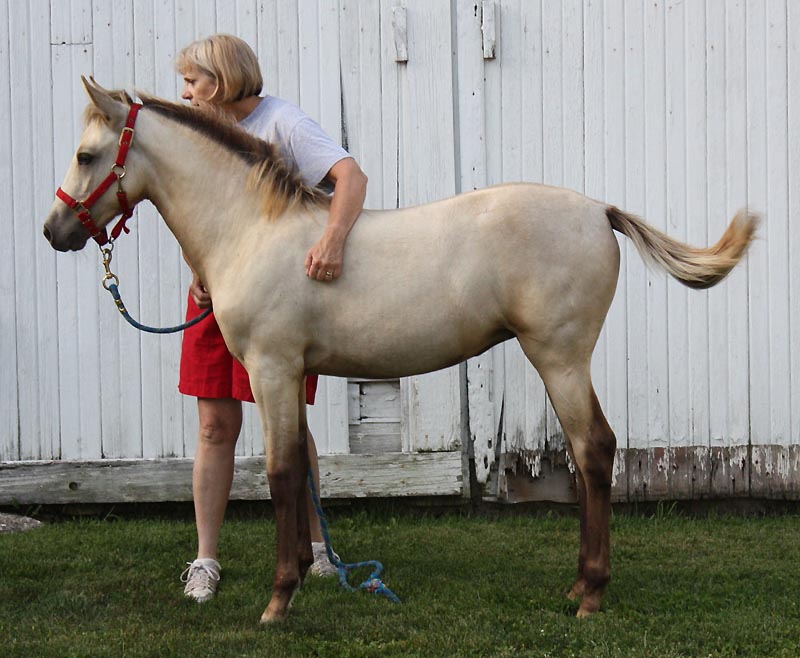 EDGEFIELD VERMEIL (Edgefield Sun Gold x Foxton Frosty Dawn), 2009 buckskin silver filly owned by (and pictured with) Charlene Cook,