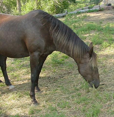 1998 silver dapple bay mare, registered as chestnut, but confirmed "Ee" (heterozygous black) via UC